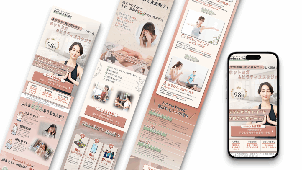LP 2025年8月21日 最終更新日時 : 2025年9月6日 inohara 【製作時間】15時間【使用ソフト】Photoshop・Canva【担当業務】デザイン【意識した亊】シンプルを意識し、女性向けに制作しました。